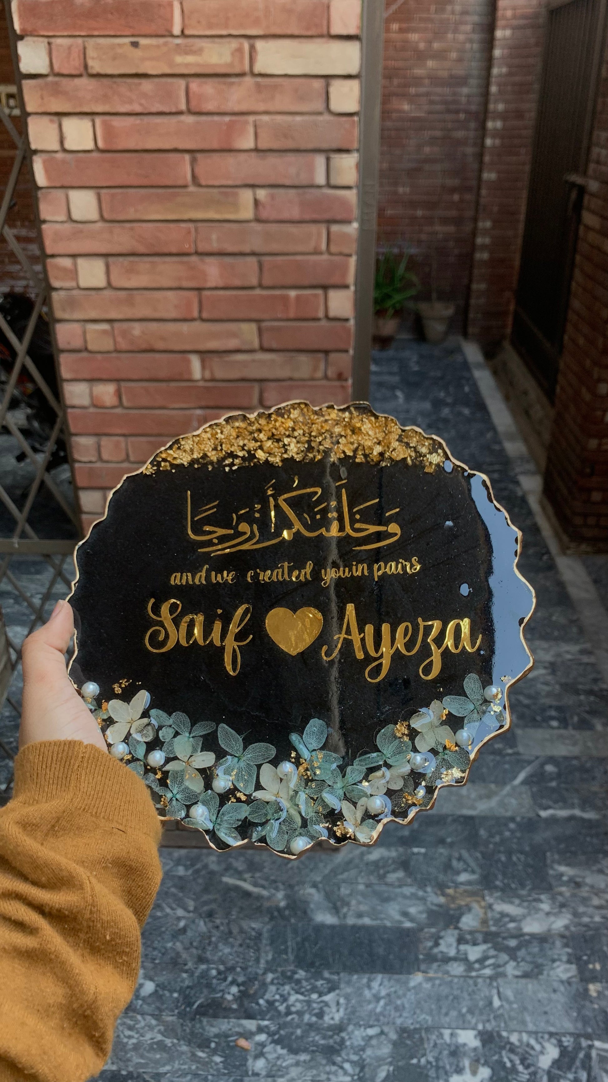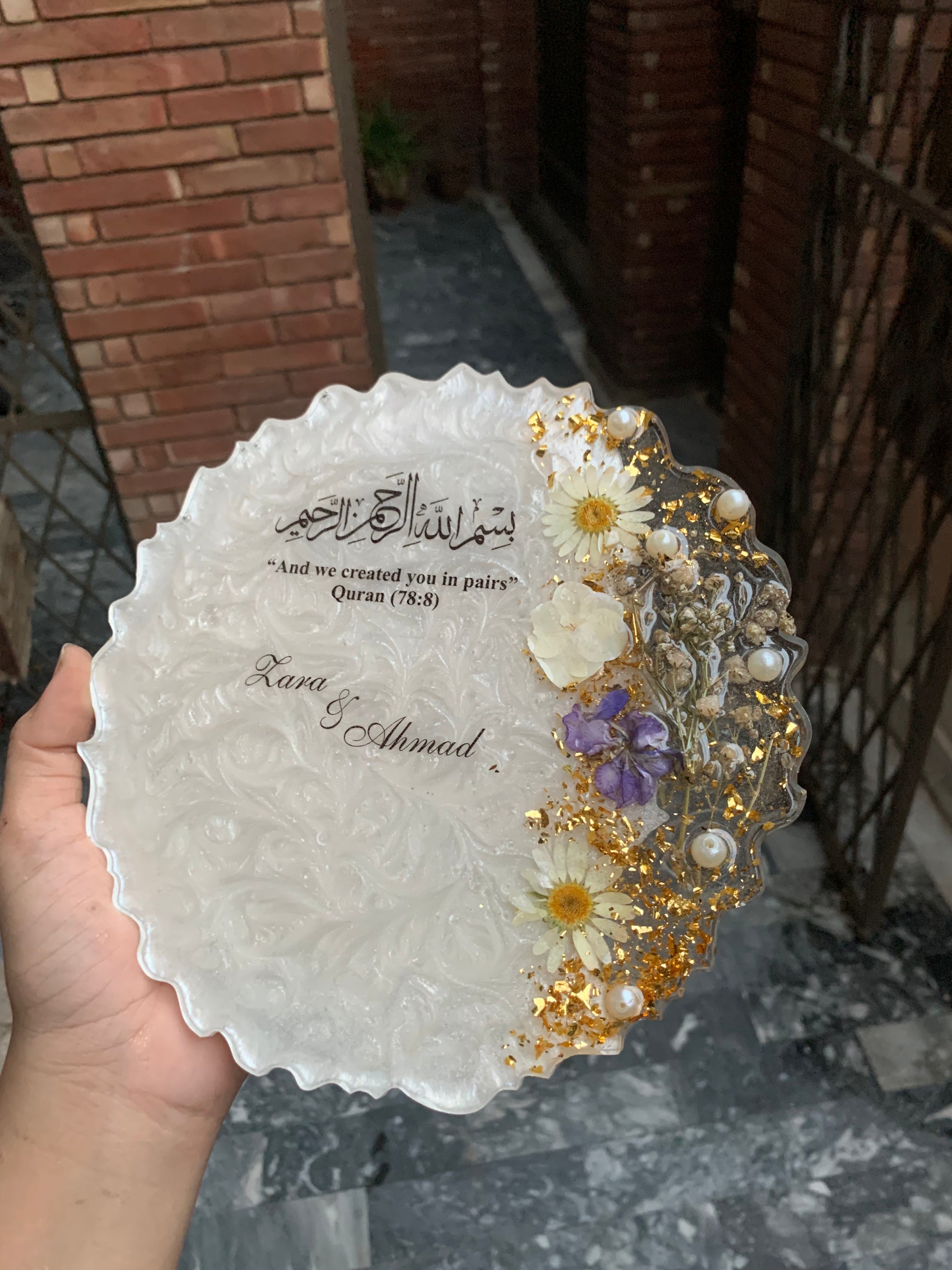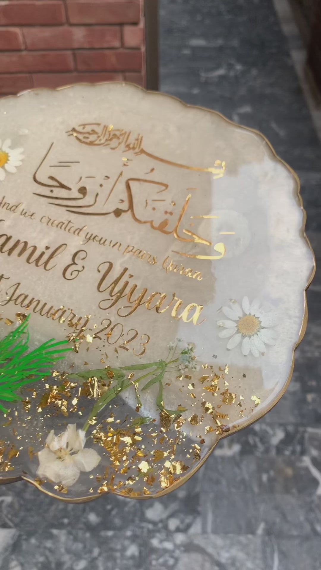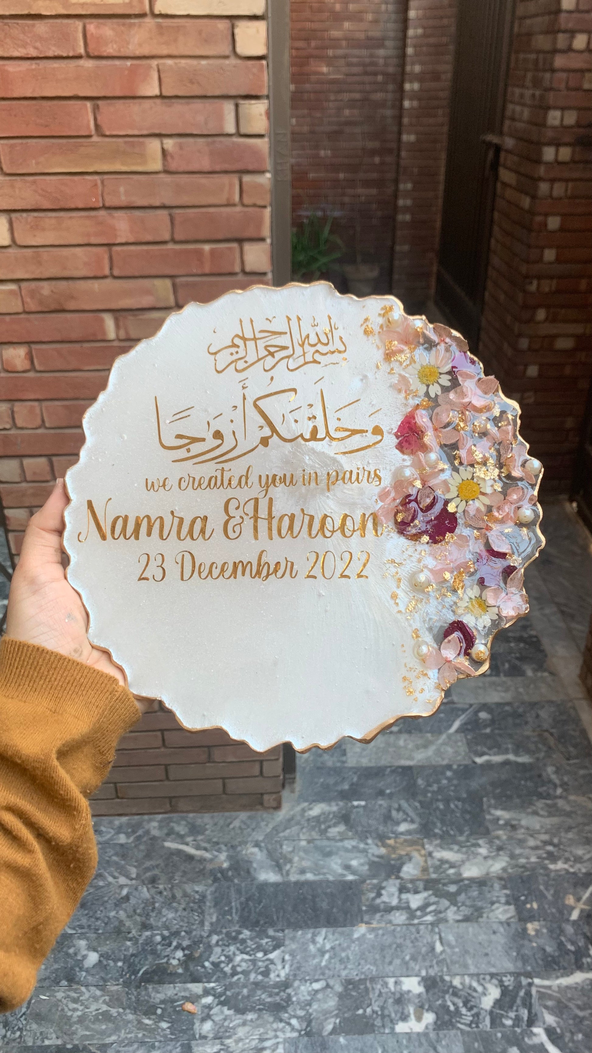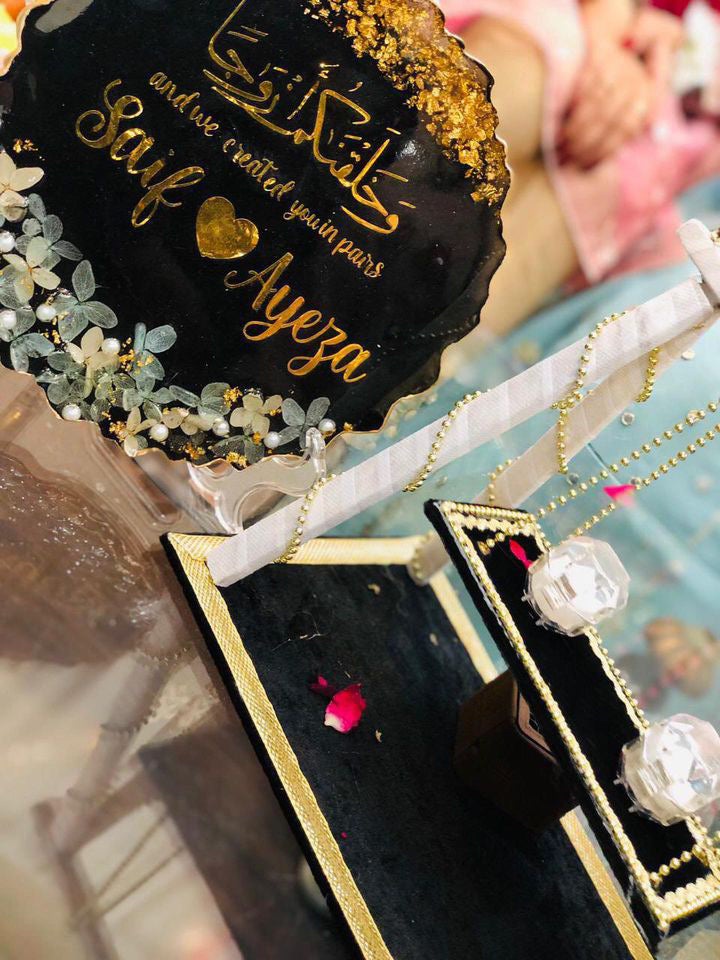 This Elegant 3D Floral Plaque will make the perfect gift for a couple on their engagement or nikkah day. Handcrafted with intricate detail, the plaque displays the couple's name and date of the special occasion. A perfect way to commemorate the celebration and a token they can cherish forever.