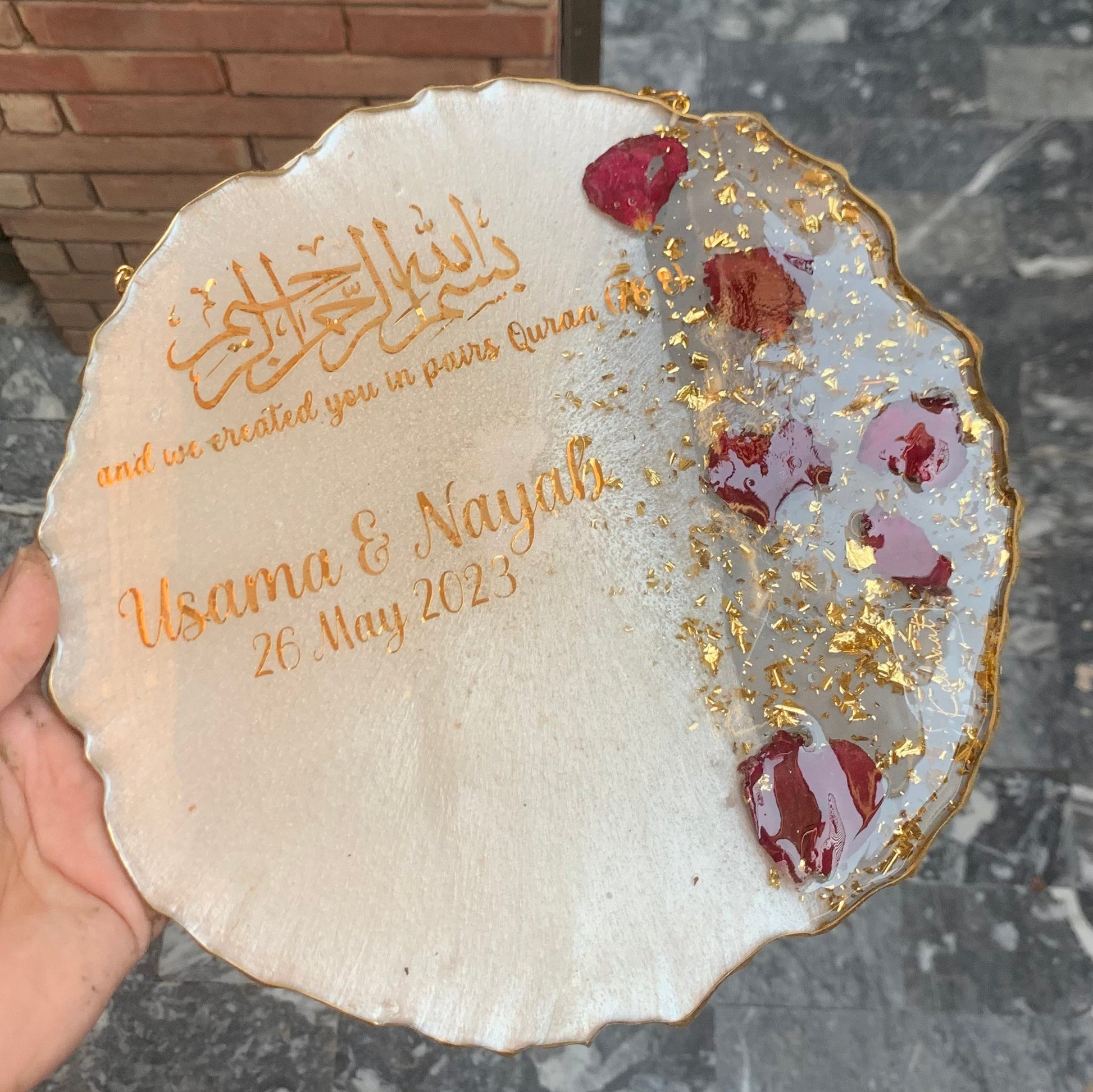 Make your special day even more memorable with this Nikkah or engagement Plaque. It features rose petal, designed to create an eye-catching look. Add a touch of elegance to your celebrations and make your event truly unforgettable.