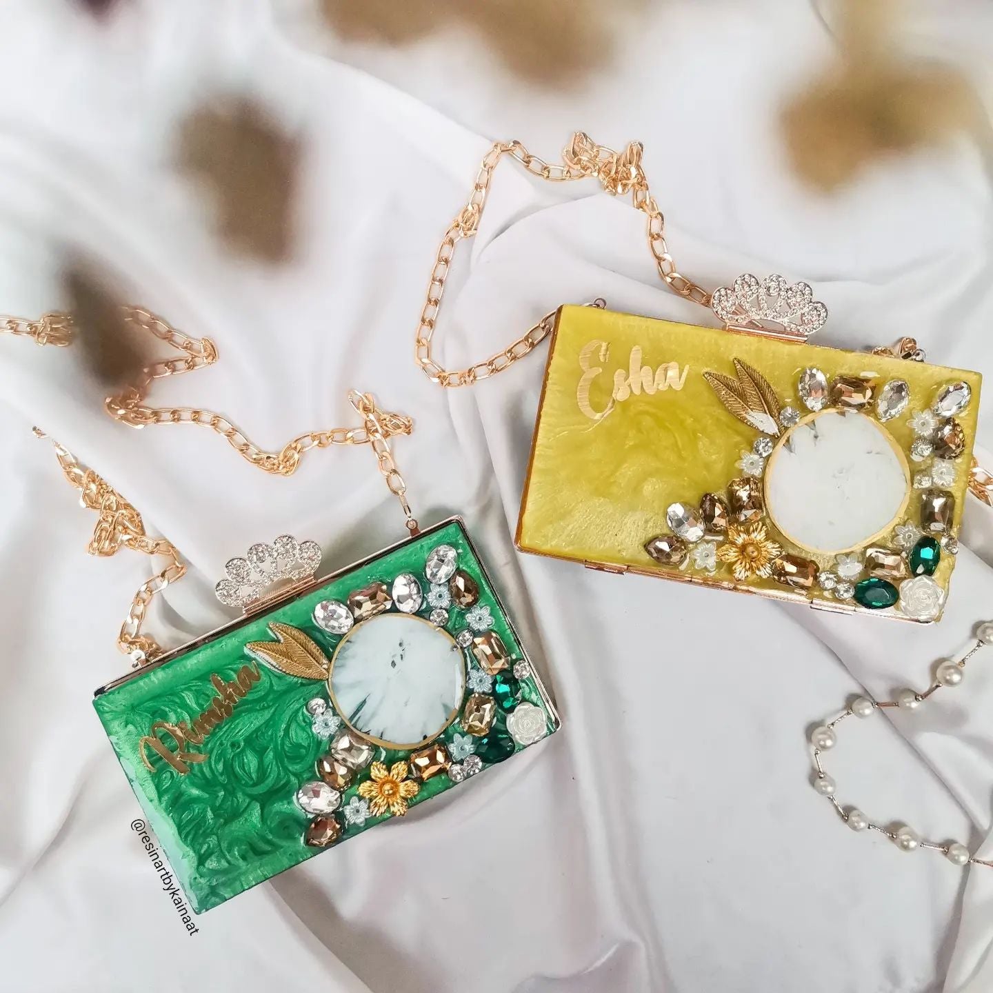 This beautiful Resin Clutch is designed to bring a touch of elegance to any outfit. It's embellished with gem stones and pearls, making it perfect for special occasions or your next night out. Take your look to the next level with this unique statement piece!