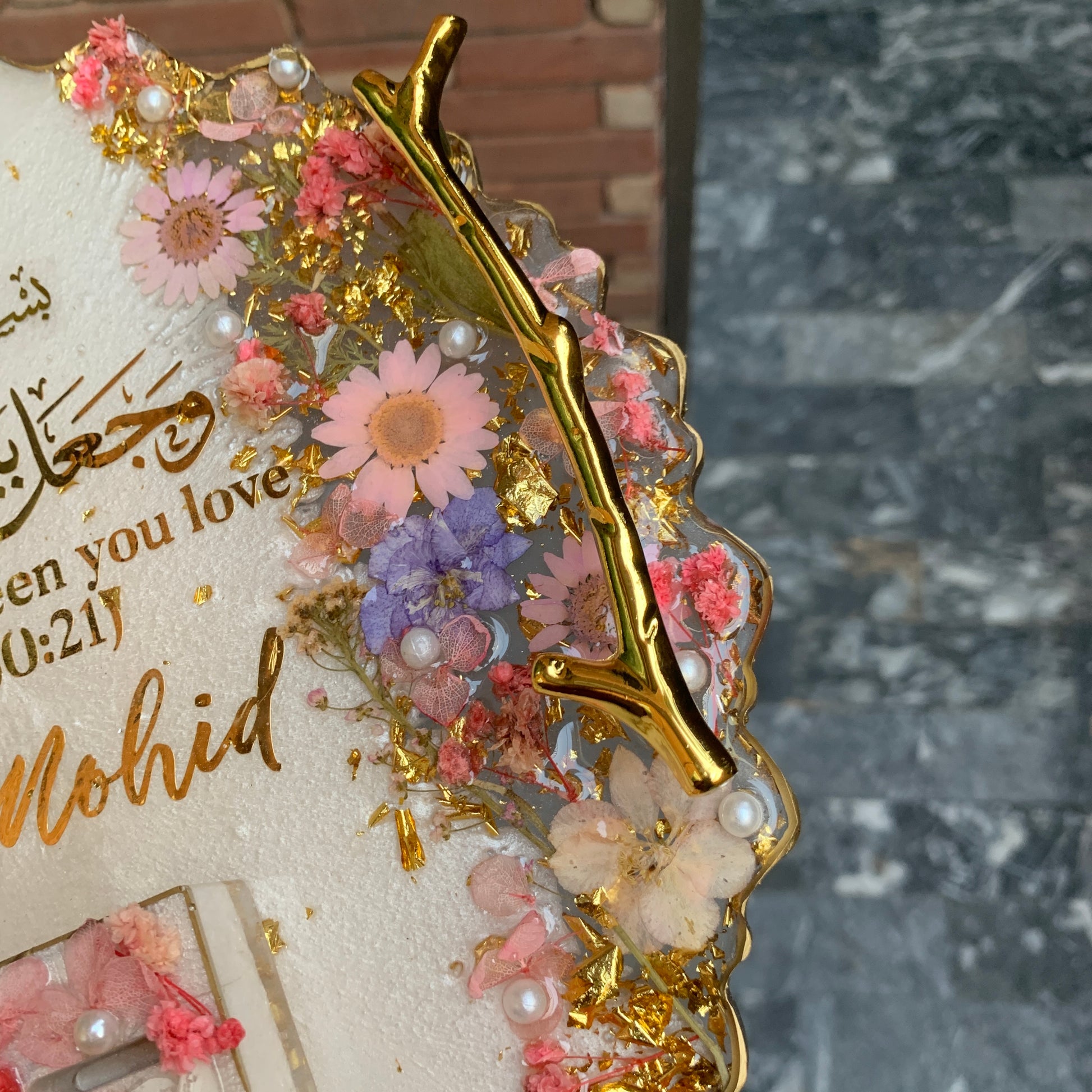 Introducing our Floral Customized Resin Tray, perfect for engagements. Made with high-quality resin and measuring at 10 inches, it will add a touch of elegance to your special day. The tray can also be paired with ring holders for a complete set. Elevate your engagement with our beautiful tray.